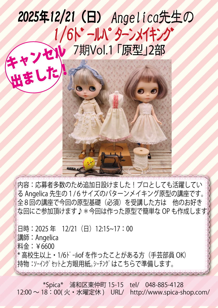 プロのパタンナーであるAngelica先生をお呼びしての特別wsです!ミシンが出来ればどなたも参加出来る回です。 no.Angelica20260112WS 2026年1/12(月、祝)Angelicaのドールパターンメイキング5期生優先「ボア耳付きフードジレ」(当日支払い・現金のみ) 【講座について】 パターンメーキングを学びたい方(1/6ドール用アウトフィット)、 色々なパターンをご自分でひいてみたい方にオススメの講座です。 ※参加対象:15才以上 【日時】:1/12(土)12:15~17:30 【定員】6名 【費用】¥7700(税込) 【内容】プロのパターンナーAngelica先生をお招きして行う1/6サイズのドールパターンメイキング講座です。 【持ち物】 ○文具類 方眼用紙(A4~)、筆記用具(シャープペン:0.3がオススメ・消しゴム:ペンタイプのものがオススメ) 方眼定規、メジャー(細い物が良い)、カーブ定規(あると良い)、紙用はさみ、メンディングテープ ○裁縫道具類 チャコペン、布用はさみ、まち針(パッチワーク用の小さいものや頭が耐熱ガラスのものがオススメ)、糸切りハサミ、縫い針、糸 (その他使いやすい道具があればご自由にお持ちください) エプロン(必要であれば)、ネオブライス★終了後、完成した作品を着せて撮影会をしますのでドールをお連れください。 ・ミシン・アイロンは教室にございます。(台数が少ない為、譲りあってご利用ください) ・パターンのクラスでは生徒様に道具をご用意頂きます。お忘れ物のないようご注意くださいませ。(オススメと同じものが揃わなくても大丈夫です) ※紛失防止の為、道具のお名前記入をお願い致します。 ・今回の型紙の原型はネオブライスのデフォルトボディ用のものを使用しますので、 お持ち頂くブライスもデフォルトボディがオススメです。また今後、可動ボディのパターン教室も開催予定です。 ・最後に作ったパターンで実際に縫製しますが お時間がおしてしまった場合は残りをお家で制作いただく場合が有ります。 【ご予約について】 [ご予約方法] ご来店の場合はレジにてスタッフにお声掛けください。 お電話での場合は営業時間内にご連絡ください。(営業時間12:00~18:00) ネットご予約の場合はカートよりご予約ください。 ご予約段階ではお支払いは不要です。当日Spicaにてお支払い下さい。ワークショップのお支払いは現金のみとさせていただきます。 定員が満員に達してからのご予約の場合、キャンセル待ちとさせて頂きます。 [キャンセルについて] やむを得ない場合は、教室開催の1週間前までに必ずご連絡下さい。(※キャンセルはなるべくお控えください。) 外部講師をお招きしてのWSですので、1週間をきったキャンセルに関しましてはキャンセル料として後日全額お支払いをお願い致します。 ※感染症等流行っておりますので、しばらくはキャンセル料は半額のお支払いに変更させて頂きます。※2020.2変更 ※不参加の場合の追加講習は予定しておりません。 【ご参加の際のご注意】 WS開始の5分前にはご来店ください。 WSに参加されないお連れ様のご見学はスペースの関係や進行上不可とさせていただきます。 終了のお時間になりましたらお店でお待ち合わせいただくなどでご対応宜しくお願い致します。 ※自粛期間再開、台風等、ご来店に危険が生じると判断した場合、講師の体調不良などやむなく中止させて頂く場合がございます。 (ご相談の上、振替日を設けさせて頂く場合もございます。) [お客様へのお願い] ★ご予約済みのお客様に、WS数日前にお店から開催ご案内をお電話又はSNS、メールでご連絡致します。 ---- 以上の事をご確認の上、お申込下さい。 |