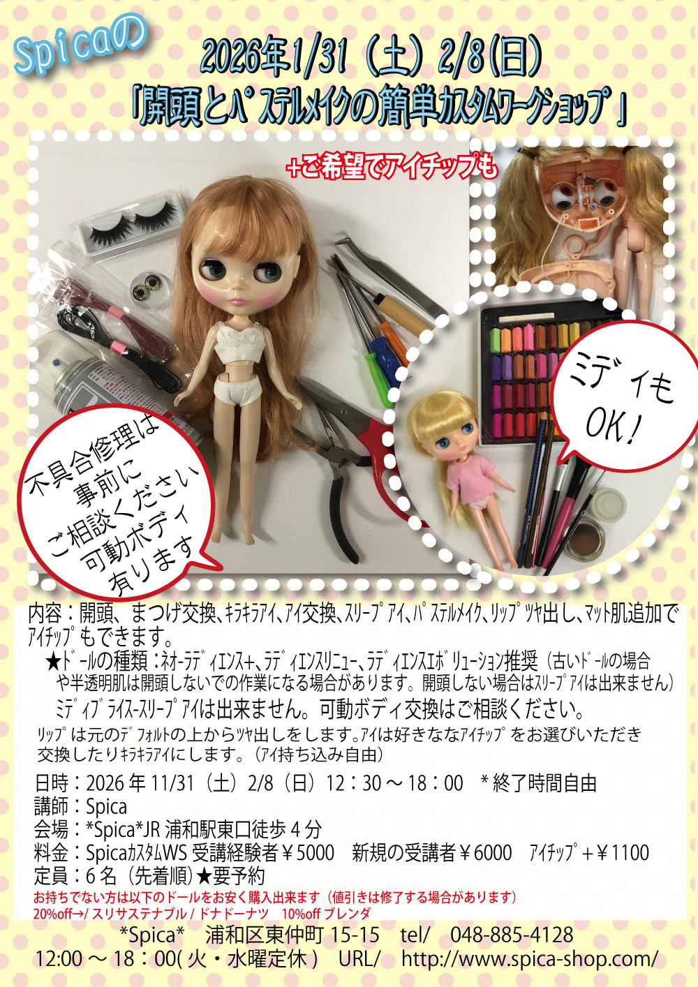 | no.Custom2026315 ・2026年3/8(日)「男の子編!開頭とパステルメイクの簡単カスタムワークショップ」/*+¥1000でヘアカット出来ます/当日払い*現金のみ3/15は満席 ★ご相談など有りましたら通信欄にお書きください。 内容検討中の部分も有ります。今回はご予約日の確保とお考えください。この後決まったこと等は 再度ご希望をお聞きします。 内容:開頭、まつげ交換、キラキラアイ、アイ交換、スリープアイ、パステルメイク、リップツヤ出し、マット 肌追加 ボディ交換、ご希望でヘアカット。(カット無しでも吟遊詩人-髪の毛有りのボアウィッグも有ります) ドールの種類:ネオブライス(ラディエンスリニュー、ラディエンスエボリューション)のみ(ボディ交換 しやすいこちらのタイプをご用意ください。違う場合は今回はボディ交換出来ません) Spicaで割引でご購入いただけるドールがあります。ご相談ください。 ヘアカットご希望の場合 開始時間が早くなります。 ★ウィッグをご持参の場合 髪の毛有の上からサイズウィッグはそのまま使用できますが 無しの 場合は頭皮をご用意いただくか いがぐりにカットする必要があります。 日時:2026年3/8(日) 12:30~18:00 (ヘアカット付は11:00~開始) 定員:6名(先着順) 費用:6000円★ヘアカット付は¥7000 ★今回は二回目以降割引はありません。 ★リップは元のデフォルトの上からツヤ出しをします。アイは好きななアイチップをお選びいただき 交換したりキラキラアイにします。 ★只今男の子ボディが手に入りづらく当店でご用意できるのはピュアニーモ男の子M、オビツ22 S胸(男女共通の為 胸が少しあります)になります。 (ピュアニーモ男の子Mはこれから入荷予定 女の子と同じ背丈のSサイズはメーカー欠品が続き 年内入荷はありません。9/26時点で店頭在庫1点のみですので お取り置きは不可。欲しい方は 先にご購入ください) ★お客様で可動ボディをご用意できる場合は ご持参ください。 【今回お持ちいただくブライスについて】 *ネオブライス(ラディエンスリニュー、ラディエンスエボリューション)のみ ★お持ち出ない方 当店でご購入できます。(アーバンフェアリーエリー・ドナドーナツは定価の20%offになります) 【材料と持ち物】 ☆ボディ→只今男の子ボディが入荷しづらい状況です。ピュアニーモ男の子Sボディが使いやすく 服の相互性も 有るのでおすすめですが メーカー欠品のため当店では年内の再入荷はありません。 ご用意できる方はお持ちください。 次に使われている ピュアニーモ男の子Mボディ オビツ22S胸(男女共有で使われている方がいらっしゃいますが 少し胸があります)でしたらご用意できる可能性があります。 ☆髪の毛について→ワークショップでカットしたり 坊主にしてウィッグを被せたり 髪の毛有る子用ウイッグ (吟遊詩人ボアウィッグはご購入可能)を使用できます。 ☆アイ交換について→お店から好きなアイチップをお買い上げいただくか ご持参ください。 ☆紐は お店の物をご購入ください。(ご持参いただく事も出来ますが 強度などで使えない場合もあります) ☆キラキラアイに使う 色紙はSpicaがご用意します ☆つけまつげもSpicaでご用意します。(¥110)あまり種類がありませんのでご持参いただけると 助かります。 ☆プルリングはお店で買うことも出来ます。 ☆汚れが気になる方はエプロン 【お願い】 *カスタムの結果は自己責任であることをご理解の上、ご参加ください。 *下記の注意事項をすべてお読みの上、「思い通りにいかない事もある」ということを念頭に置いてください。 当講座でご自身で行ってしまった不具合(例:傷、破損など)につきまして、当方では責任を負いかねます。 [ご予約方法] ネットでご予約又はお電話でお願いします。ご来店の際に店頭で承る事も出来ます。 [キャンセルについて] キャンセルは1週間前までにお願いします。それ以降はキャンセル料半額かかります。 ★直前キャンセルの方が多いのでキャンセル料変更しました。 【開催のご連絡】開催のご連絡を数日前にお電話でさせていただきます [ご注意] 教室当日、体調が悪い場合は無理せずご連絡ください。 以上の事をご確認の上、お申込下さい。 宜しくお願い致します。 |