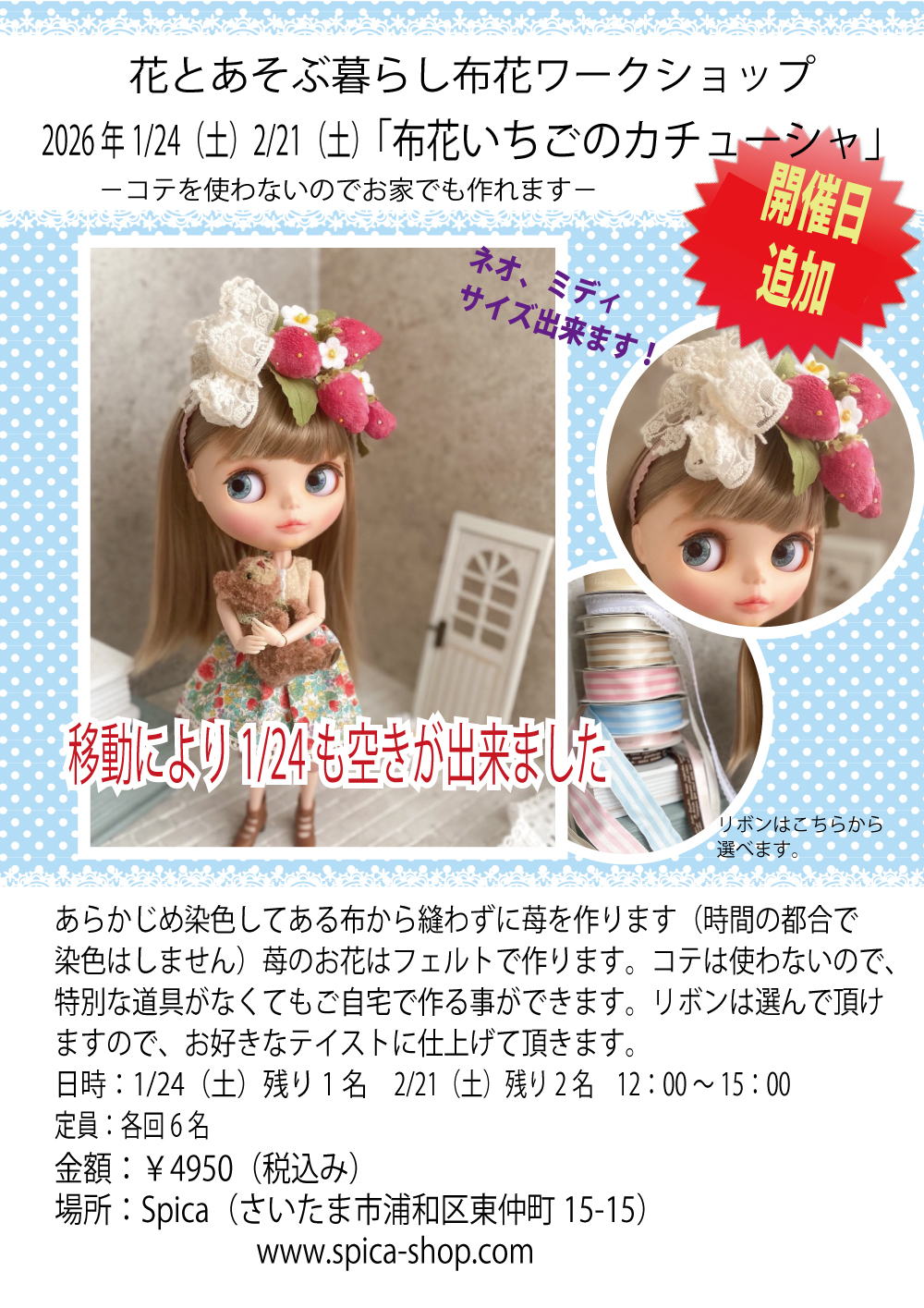 | FlowerN202602214WS 2026年1/24(土)2/21(土)花とあそぶ暮らし先生の布花ワークショップ-「布花いちごカチューシャ」 *移動により1/24 1名空きが出ました。 ・会費:¥4950 (材料代含む・税込) ・開催日:2026年1/24(土)残り1名 2/21(土)残り2名*お日にちお選びください ・時間:12:00~15:00 ・内容:「花とあそぶ暮らし」先生の布花ワークショップ第2弾 あらかじめ染色してある布から縫わずに苺を作ります(時間の都合で染色はしません)苺のお花は フェルトで作ります。コテは使わないので、特別な道具がなくてもご自宅で作る事ができます。 リボンは選んで頂けますので、お好きなテイストに仕上げて頂きます。 ・持ち物:完成後、撮影を行います。ブライスをお連れください ハサミ(小さめの布用)、目打ちなどの裁縫道具をお持ちください。 ・作業を行いますので気になる方はエプロンをご用意ください。 ※WSに参加されないお連れ様のWSご見学はスペースの関係や進行上不可とさせていただきます。 終了のお時間になりましたらお店でお待ち合わせいただくなどでご対応宜しくお願い致します。予めご了承下さい。 [ご予約方法] ネットでのご予約方法:カートよりご予約ください。(お電話・店頭でのご予約も可) ※キャンセルはなるべく早くご連絡ください。 開催1週間を切ったキャンセルは材料代¥2475をご負担頂きます。(材料をお渡し致します。) |