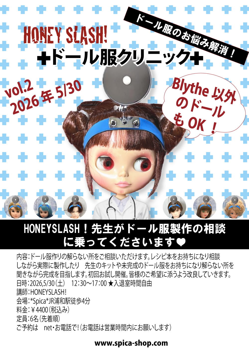 | 【講師:HONEY SLASH!】2026年5月30日(土)「ドール服クリニック」ご相談と製作/ ブライス他沢山のドール対応」※当日支払い(現金のみ) 【日時】2026年5/30(土)12:00~17:00 【定員】6名 【費用】¥4400(税込) 【持ち物】裁縫道具、ドール、エプロン(必要であれば)★終了後、完成した作品を着せて撮影会をしますのでドールをお連れください。 【内容】先生がドール服製作のいろいろな悩みをご相談に乗ってくださいます。ご相談しながらの製作もOK 先生のワークショップやキットの作りかけのドール服などもお持ちいただけます。 ブライスだけでなく色々なサイズのドールサイズで作れます。お好きなサイズをお選びください! ☆ サイズは ネオブライス、ミディブライス、リビングデッドドールズ、momoko、ジェニー、六分の一男子図鑑エイト・ナインサイズなどもご相談できます ※参加資格-中学生以上 【ご予約について】 [ご予約方法] ご来店の場合はレジにてスタッフにお声掛けください。 お電話での場合は営業時間内にご連絡ください。(営業時間12:00~18:00) ネットご予約の場合はカートよりご予約ください。 ご予約段階ではお支払いは不要です。当日Spicaにてお支払い下さい。※ワークショップのお支払いは現金のみとさせていただきます。 定員が満員に達してからのご予約の場合、キャンセル待ちとさせて頂きます。 [キャンセルについて] やむを得ない場合は、教室開催の1週間前までに必ずご連絡下さい。(※キャンセルはなるべくお控えください。) 外部講師をお招きしてのWSですので、1週間をきったキャンセルに関しましてはキャンセル料として後日半額をお支払いください。 |