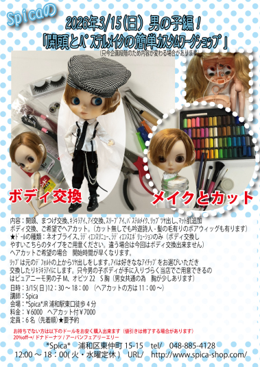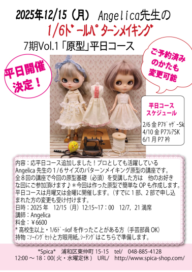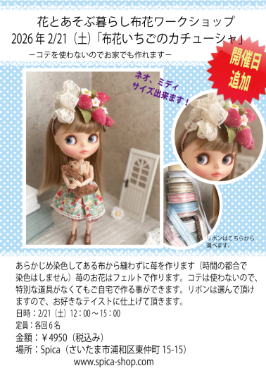 | no.spicahat20260214ws ・2026年2/14(日)「Spica*ドール帽子教室 布フェルトのウサギハット」*当日支払い(現金のみ クレジット不可) *お時間:1部、2部 サイズ:ネオ、ミディ お色:ベージュ、キャメル、杢グレーから選べます ※参加対象:ミシンが使える方 ※参加年齢ー高校生以上 【日時】:2026年2/14(日)1部12:00~15:00 2部15:30~18:30 【内容】2mm厚の布フェルトをミシンで縫って ウサギのシルクハットを作ります。 お耳の中にはピンクのボアが!(ボアは白も有り当日選べます) ウサギ以外の耳でも 耳無しでお花やリボンの飾りでもOKです。 【お色】ベージュ、キャメル、杢グレー 【参加費】 ¥5000 【持ち物】材料はこちらでご用意しますが 造花、リボンのご持参も可能です。 筆記用具、布はさみ、まち針、糸切りハサミ、縫い針、ブライス (その他使いやすい 道具があればご自由にお持ちください) ☆ミシン・アイロンは教室にございます。(台数が少ない為譲りあってご利用ください) 終了後撮影会をしますので ブライスをお連れください。(お洋服、靴など撮影に必要な衣装も着せてお連れ下さいませ。) 受講中の水分補給はペットボトルでお持ちください。 作業を行いますので気になる方はエプロンをご用意ください。 ※WSに参加されないお連れ様のWSご見学はスペースの関係や進行上不可とさせていただきます。 終了のお時間になりましたらお店でお待ち合わせいただくなどでご対応宜しくお願い致します。 予めご了承下さい。 [ご予約方法] ネットでのご予約方法:カートよりご予約ください。(お電話・店頭でのご予約も可) 予約段階ではお支払いは不要です。 当日Spicaにて参加費を現金でお支払い下さい 定員が満員に達してからのご予約の場合、キャンセル待ちとさせて頂きます。 ★ご予約済みのお客様に、WS数日前にお店から開催か延期をお電話でご連絡致します。 ※キャンセルはなるべくお早めにご連絡ください。 開催1週間を切ったキャンセルはレシピと材料費代半額をご負担頂きます。(材料をお渡し致します。) |