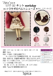 | no.kitWS20251116 2026年1/17(土)第13回キットワークショップ「ウサギのベルトシューズ」1部からお入れします。 お色、サイズをお選びください。当日支払い(クレジット不可)い ★1部満席の場合2部に切り替わるのにお時間がかかる場合があります。 ・デザイン:ベルトブーツ ・会費:¥3800(材料代含む・税込) ・開催日:2026年1/17(土) ・時間:1部12:00~14:30 (1部満席の場合開催 2部15:00~17:30 ) ・定員 各回6名 ・色とサイズ:ネオ-黒(5),ピンク(3),白(満席) ミディ-黒(2),ピンク(3),茶(3) ・内容:カット済みのドールシューズのキットを手縫いで仕上げます。革に穴が開いているのでそれを合せて縫っていく 簡単ワークショップですが 本格的な靴に仕上がります。今回は縫った後 ウサギのお顔をアクリル絵の具で描きます。 ・持ち物:完成後、撮影を行います。ブライスをお連れください ・作業を行いますので気になる方はエプロンをご用意ください。 ・道具・材料はSpicaで用意致します。 ・中学生以上。 ※WSに参加されないお連れ様のWSご見学はスペースの関係や進行上不可とさせていただきます。 終了のお時間になりましたらお店でお待ち合わせいただくなどでご対応宜しくお願い致します。予めご了承下さい。 [ご予約方法] ネットでのご予約方法:カートよりご予約ください。(お電話・店頭でのご予約も可) ご予約段階ではお支払いは不要です。 当日Spicaにて¥3800(税込・材料費込み)をお支払い下さい 定員が満員に達してからのご予約の場合、キャンセル待ちとさせて頂きます。 ★ご予約済みのお客様に、WS数日前にお店から開催か延期をお電話でご連絡致します。 ご注文時に御希望のお時間 ・お色を通信欄にお書きください ※キャンセルはなるべく早くご連絡ください。 開催1週間を切ったキャンセルは材料代¥1950をご負担頂きます。(材料をお渡し致します。) |