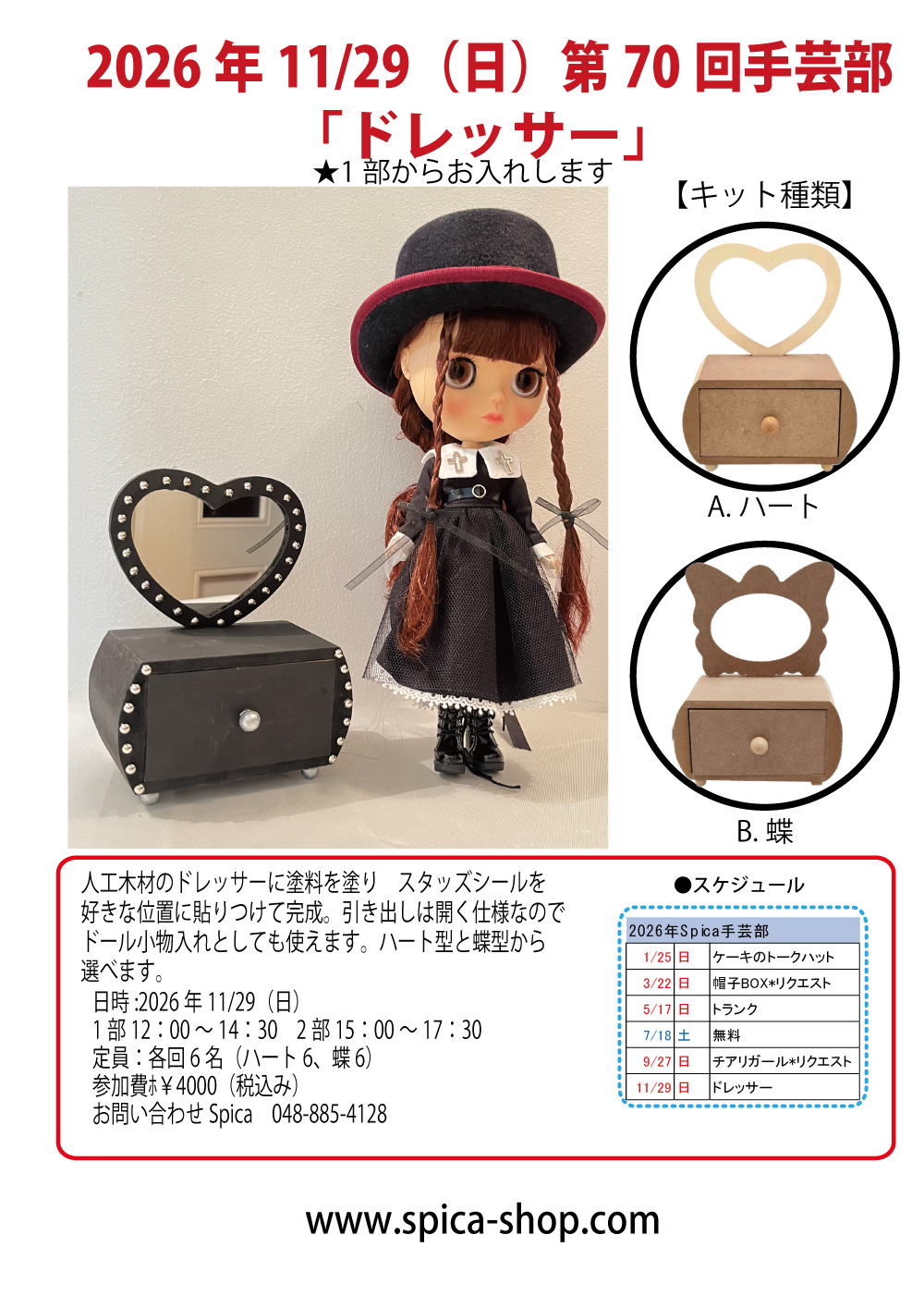 | no.club20261129 ・2026年11/29(日) Spica手芸部 第70回 「ドレッサー」※当日支払い(現金のみ)*1部よりお入れします 【日時】2026年11/29(日) 1部 12:00~14:30 2部 15:00~17:30(1部満席の場合開催) 【定員】各回6名 【費用】¥4000 【種類】A.ハート B.蝶 【内容】人工木材のドレッサーの土台にペイントして スタッズシールでデコレーションします。 元のドレッサーは Aハート型とB蝶があります。 キットは各6点ずつですので 早いもの順にお取りします。 在庫調整の時差で カートに有っても実際にはお取りできない場合があります。 【持ち物】道具は揃っています。 必要であればエプロン、ブライス等ドール★終了後、完成した作品と撮影会をしますのでドールをお持ちの方はお連れください。 ・初心者の方でも簡単に作れる内容になっております。 ・小学生からご参加頂けます。(お一人で作業が難しいご年齢のお子様は、ご家族の方もご一緒に参加をお願いしております。) ※WSに参加されないお連れ様のWSご見学はスペースの関係や進行上不可とさせていただきます。 【ご予約について】 [ご予約方法] ご来店の場合はレジにてスタッフにお声掛けください。 お電話での場合は営業時間内にご連絡ください。(営業時間12:00~18:00・水曜以外) ネットご予約の場合はカートよりご予約ください。 ご予約段階ではお支払いは不要です。当日Spicaにてお支払い下さい。※ワークショップのお支払いは現金のみとさせていただきます。 定員が満員に達してからのご予約の場合、キャンセル待ちとさせて頂きます。 2部構成のワークショップは1部から予約をお入れします。2部の時間でしか参加できない場合は電話、メール、インスタDMからお問い合わせください。 [キャンセルについて] やむを得ない場合は、教室開催の1週間前までに必ずご連絡下さい。(※キャンセルはなるべくお控えください。) 1週間をきったキャンセルに関しましてはキャンセル料、キット代として後日半額お支払いをお願い致します。 |