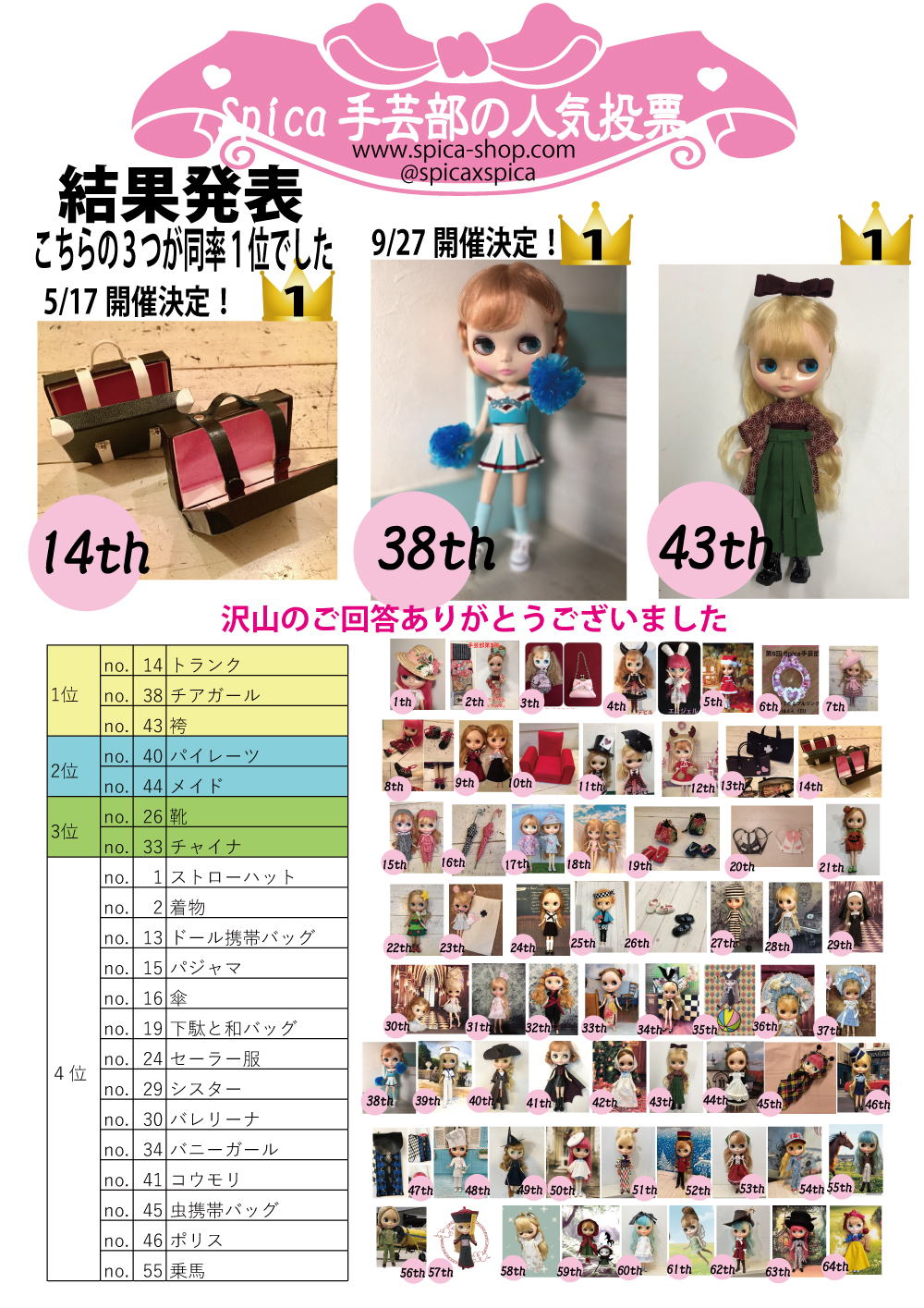| no.club20260927 ・2026年9/27(日) Spica手芸部「第69回 「チアガール」★リクエストワークショップ※当日支払い(現金のみ)*1部よりお入れします 【日時】2026年9/27(日) 1部 12:00~14:30 2部 15:00~17:30(1部満席の場合開催) 【定員】各回6名 【費用】¥3800 【内容】ボンドでチアガールのTシャツとスカート ポンポンを作ります。 胸にはチーム「Spica」のワッペンを付けます。 (スニーカーは¥700で購入出来ます 【持ち物】道具は揃っています。 必要であればエプロン、ブライス等ドール★終了後、完成した作品と撮影会をしますのでドールをお持ちの方はお連れください。 ・初心者の方でも簡単に作れる内容になっております。 ・小学生からご参加頂けます。(お一人で作業が難しいご年齢のお子様は、ご家族の方もご一緒に参加をお願いしております。) ※WSに参加されないお連れ様のWSご見学はスペースの関係や進行上不可とさせていただきます。 【ご予約について】 [ご予約方法] ご来店の場合はレジにてスタッフにお声掛けください。 お電話での場合は営業時間内にご連絡ください。(営業時間12:00~18:00・水曜以外) ネットご予約の場合はカートよりご予約ください。 ご予約段階ではお支払いは不要です。当日Spicaにてお支払い下さい。※ワークショップのお支払いは現金のみとさせていただきます。 定員が満員に達してからのご予約の場合、キャンセル待ちとさせて頂きます。 2部構成のワークショップは1部から予約をお入れします。2部の時間でしか参加できない場合は電話、メール、インスタDMからお問い合わせください。 [キャンセルについて] やむを得ない場合は、教室開催の1週間前までに必ずご連絡下さい。(※キャンセルはなるべくお控えください。) 1週間をきったキャンセルに関しましてはキャンセル料、キット代として後日半額お支払いをお願い致します。 |