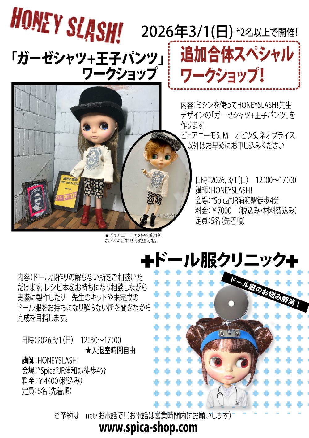 | ★受講内容をお選びください「ガーゼシャツ+王子パンツ」又は「ドール服クリニック」*クリニックは¥4400 2名以上で開催します ※記載ドールでブライス以外の場合はお早めにご予約ください。 no.ws20260301HONEYSLASH 追加合体スペシャル【講師:HONEY SLASH!】2026年3/1(日)「ガーゼシャツ+王子パンツorクリニック」ワークショップ/男の子Body他沢山のドール対応」※当日支払い(現金のみ) 「ガーゼシャツ+王子パンツ」ワークショップ内容 ★男の子用のデザイン(ピュアニーモS、M オビツS)ですが ネオブライス ミディブライス、リビングデッドドールズ、momoko、ジェニー、六分の一男子図鑑エイト・ナインサイズ等も作れます。ご相談ください。 【日時】2026年3/1(日)12:00~17:00 【定員】2つのWS合計で5名 【費用】¥7000(税込) 【内容】ミシンを使ってHONEYSLASH!先生デザインの「ガーゼシャツ+王子パンツ」を制作します。 【持ち物】裁縫道具、ドール、エプロン(必要であれば)★終了後、完成した作品を着せて撮影会をしますのでドールをお連れください。 ☆ サイズはピュアニーモS、M オビツS ネオブライス ミディブライス、リビングデッドドールズ、momoko、ジェニー、六分の一男子図鑑 エイト・ナインサイズ等も作れます。ご相談ください。 ※ネオ、ミディ以外の方は型紙を起こしますのでお早めにお申し込みください。 ※参加資格-中学生以上 「ドール服クリニック」 【講師:HONEY SLASH!】2026年3月1日(日)「ドール服クリニック」ご相談と製作/ ブライス他沢山のドール対応」※当日支払い(現金のみ) 【日時】2026年5/30(土)12:00~17:00 【定員】2つのWS合計で5名 【費用】¥4400(税込) 【持ち物】裁縫道具、ドール、エプロン(必要であれば)★終了後、完成した作品を着せて撮影会をしますのでドールをお連れください。 【内容】先生がドール服製作のいろいろな悩みをご相談に乗ってくださいます。ご相談しながらの製作もOK 先生のワークショップやキットの作りかけのドール服などもお持ちいただけます。 ブライスだけでなく色々なサイズのドールサイズで作れます。お好きなサイズをお選びください! ☆ サイズは ネオブライス、ミディブライス、リビングデッドドールズ、momoko、ジェニー、六分の一男子図鑑エイト・ナインサイズなどもご相談できます 【ご予約について】 [ご予約方法] ご来店の場合はレジにてスタッフにお声掛けください。 お電話での場合は営業時間内にご連絡ください。(営業時間12:00~18:00) ネットご予約の場合はカートよりご予約ください。 ご予約段階ではお支払いは不要です。当日Spicaにてお支払い下さい。※ワークショップのお支払いは現金のみとさせていただきます。 定員が満員に達してからのご予約の場合、キャンセル待ちとさせて頂きます。 [キャンセルについて] やむを得ない場合は、教室開催の1週間前までに必ずご連絡下さい。(※キャンセルはなるべくお控えください。) 外部講師をお招きしてのWSですので、1週間をきったキャンセルに関しましてはキャンセル料として後日全額お支払いをお願い致します。 ※感染症等流行っておりますので、しばらくはキャンセル料は半額のお支払いに変更させて頂きます。※2020.2変更 ※不参加の場合の追加講習は予定しておりません。 |