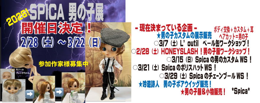 | no.Custom2026315 ・2026年3/15(日)「男の子編!開頭とパステルメイクの簡単カスタムワークショップ」/*+¥1000でヘアカット出来ます/当日払い*現金のみ ★ご相談など有りましたら通信欄にお書きください。 内容検討中の部分も有ります。今回はご予約日の確保とお考えください。この後決まったこと等は 再度ご希望をお聞きします。 内容:開頭、まつげ交換、キラキラアイ、アイ交換、スリープアイ、パステルメイク、リップツヤ出し、マット 肌追加 ボディ交換、ご希望でヘアカット。(カット無しでも吟遊詩人-髪の毛有りのボアウィッグも有ります) ドールの種類:ネオブライス(ラディエンスリニュー、ラディエンスエボリューション)のみ(ボディ交換 しやすいこちらのタイプをご用意ください。違う場合は今回はボディ交換出来ません) Spicaで割引でご購入いただけるドールがあります。ご相談ください。 ヘアカットご希望の場合 開始時間が早くなります。 ★ウィッグをご持参の場合 髪の毛有の上からサイズウィッグはそのまま使用できますが 無しの 場合は頭皮をご用意いただくか いがぐりにカットする必要があります。 日時:2026年3/15(日)残り3名 12:30~18:00 (ヘアカット付は11:00~開始) 定員:6名(先着順) 費用:6000円★ヘアカット付は¥7000 ★今回は二回目以降割引はありません。 ★リップは元のデフォルトの上からツヤ出しをします。アイは好きななアイチップをお選びいただき 交換したりキラキラアイにします。 ★只今男の子ボディが手に入りづらく当店でご用意できるのはピュアニーモ男の子M、オビツ22 S胸(男女共通の為 胸が少しあります)になります。 (ピュアニーモ男の子Mはこれから入荷予定 女の子と同じ背丈のSサイズはメーカー欠品が続き 年内入荷はありません。9/26時点で店頭在庫1点のみですので お取り置きは不可。欲しい方は 先にご購入ください) ★お客様で可動ボディをご用意できる場合は ご持参ください。 【今回お持ちいただくブライスについて】 *ネオブライス(ラディエンスリニュー、ラディエンスエボリューション)のみ ★お持ち出ない方 当店でご購入できます。(アーバンフェアリーエリー・ドナドーナツは定価の20%offになります) 【材料と持ち物】 ☆ボディ→只今男の子ボディが入荷しづらい状況です。ピュアニーモ男の子Sボディが使いやすく 服の相互性も 有るのでおすすめですが メーカー欠品のため当店では年内の再入荷はありません。 ご用意できる方はお持ちください。 次に使われている ピュアニーモ男の子Mボディ オビツ22S胸(男女共有で使われている方がいらっしゃいますが 少し胸があります)でしたらご用意できる可能性があります。 ☆髪の毛について→ワークショップでカットしたり 坊主にしてウィッグを被せたり 髪の毛有る子用ウイッグ (吟遊詩人ボアウィッグはご購入可能)を使用できます。 ☆アイ交換について→お店から好きなアイチップをお買い上げいただくか ご持参ください。 ☆紐は お店の物をご購入ください。(ご持参いただく事も出来ますが 強度などで使えない場合もあります) ☆キラキラアイに使う 色紙はSpicaがご用意します ☆つけまつげもSpicaでご用意します。(¥110)あまり種類がありませんのでご持参いただけると 助かります。 ☆プルリングはお店で買うことも出来ます。 ☆汚れが気になる方はエプロン 【お願い】 *カスタムの結果は自己責任であることをご理解の上、ご参加ください。 *下記の注意事項をすべてお読みの上、「思い通りにいかない事もある」ということを念頭に置いてください。 当講座でご自身で行ってしまった不具合(例:傷、破損など)につきまして、当方では責任を負いかねます。 [ご予約方法] ネットでご予約又はお電話でお願いします。ご来店の際に店頭で承る事も出来ます。 [キャンセルについて] キャンセルは1週間前までにお願いします。それ以降はキャンセル料半額かかります。 ★直前キャンセルの方が多いのでキャンセル料変更しました。 【開催のご連絡】開催のご連絡を数日前にお電話でさせていただきます [ご注意] 教室当日、体調が悪い場合は無理せずご連絡ください。 以上の事をご確認の上、お申込下さい。 宜しくお願い致します。 |