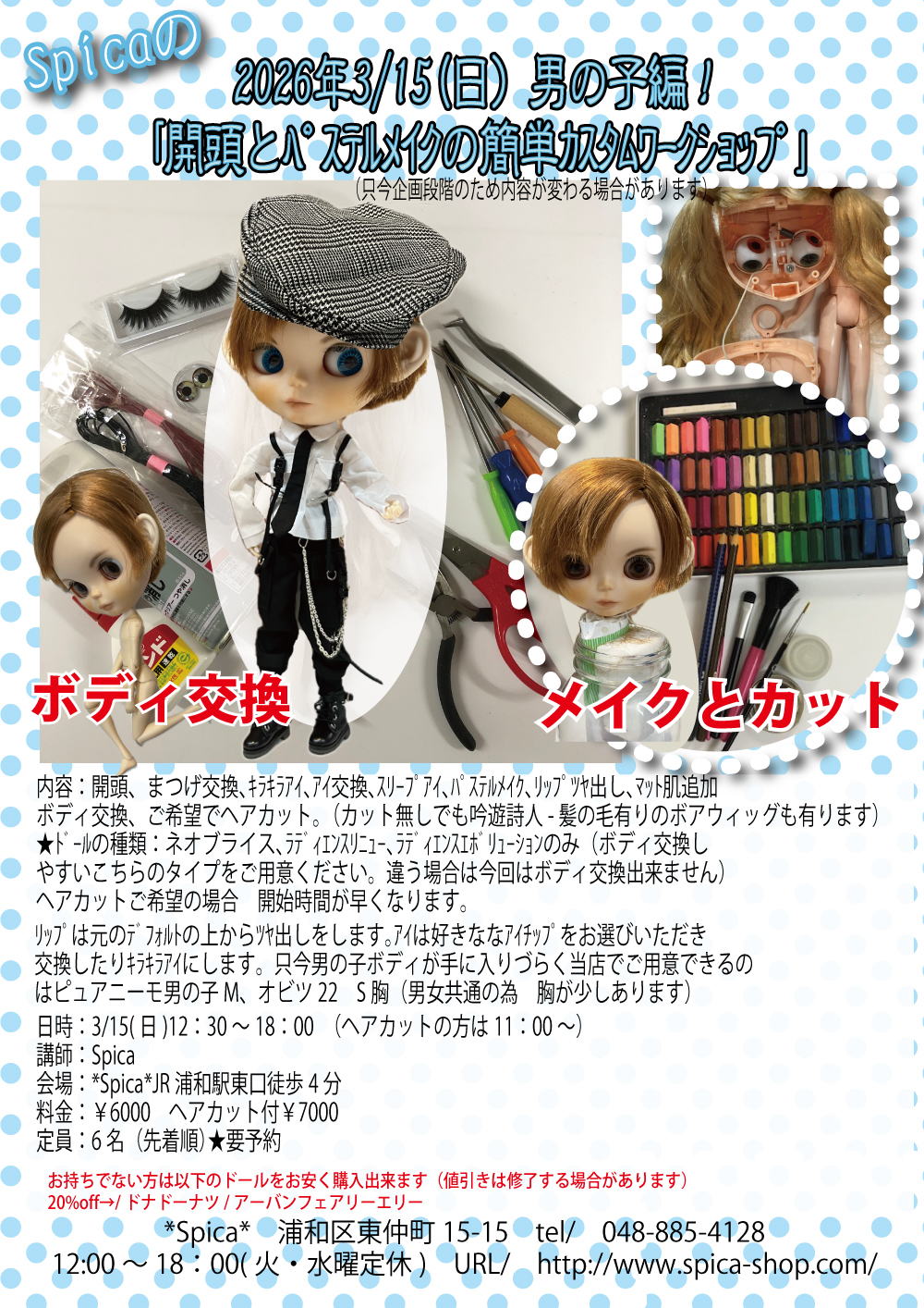 | no.Custom2026315 ・2026年3/15(日)「男の子編!開頭とパステルメイクの簡単カスタムワークショップ」/*+¥1000でヘアカット出来ます/当日払い*現金のみ ★ご相談など有りましたら通信欄にお書きください。 内容検討中の部分も有ります。今回はご予約日の確保とお考えください。この後決まったこと等は 再度ご希望をお聞きします。 内容:開頭、まつげ交換、キラキラアイ、アイ交換、スリープアイ、パステルメイク、リップツヤ出し、マット 肌追加 ボディ交換、ご希望でヘアカット。(カット無しでも吟遊詩人-髪の毛有りのボアウィッグも有ります) ドールの種類:ネオブライス(ラディエンスリニュー、ラディエンスエボリューション)のみ(ボディ交換 しやすいこちらのタイプをご用意ください。違う場合は今回はボディ交換出来ません) Spicaで割引でご購入いただけるドールがあります。ご相談ください。 ヘアカットご希望の場合 開始時間が早くなります。 ★ウィッグをご持参の場合 髪の毛有の上からサイズウィッグはそのまま使用できますが 無しの 場合は頭皮をご用意いただくか いがぐりにカットする必要があります。 日時:2026年3/15(日)残り3名 12:30~18:00 (ヘアカット付は11:00~開始) 定員:6名(先着順) 費用:6000円★ヘアカット付は¥7000 ★今回は二回目以降割引はありません。 ★リップは元のデフォルトの上からツヤ出しをします。アイは好きななアイチップをお選びいただき 交換したりキラキラアイにします。 ★只今男の子ボディが手に入りづらく当店でご用意できるのはピュアニーモ男の子M、オビツ22 S胸(男女共通の為 胸が少しあります)になります。 (ピュアニーモ男の子Mはこれから入荷予定 女の子と同じ背丈のSサイズはメーカー欠品が続き 年内入荷はありません。9/26時点で店頭在庫1点のみですので お取り置きは不可。欲しい方は 先にご購入ください) ★お客様で可動ボディをご用意できる場合は ご持参ください。 【今回お持ちいただくブライスについて】 *ネオブライス(ラディエンスリニュー、ラディエンスエボリューション)のみ ★お持ち出ない方 当店でご購入できます。(アーバンフェアリーエリー・ドナドーナツは定価の20%offになります) 【材料と持ち物】 ☆ボディ→只今男の子ボディが入荷しづらい状況です。ピュアニーモ男の子Sボディが使いやすく 服の相互性も 有るのでおすすめですが メーカー欠品のため当店では年内の再入荷はありません。 ご用意できる方はお持ちください。 次に使われている ピュアニーモ男の子Mボディ オビツ22S胸(男女共有で使われている方がいらっしゃいますが 少し胸があります)でしたらご用意できる可能性があります。 ☆髪の毛について→ワークショップでカットしたり 坊主にしてウィッグを被せたり 髪の毛有る子用ウイッグ (吟遊詩人ボアウィッグはご購入可能)を使用できます。 ☆アイ交換について→お店から好きなアイチップをお買い上げいただくか ご持参ください。 ☆紐は お店の物をご購入ください。(ご持参いただく事も出来ますが 強度などで使えない場合もあります) ☆キラキラアイに使う 色紙はSpicaがご用意します ☆つけまつげもSpicaでご用意します。(¥110)あまり種類がありませんのでご持参いただけると 助かります。 ☆プルリングはお店で買うことも出来ます。 ☆汚れが気になる方はエプロン 【お願い】 *カスタムの結果は自己責任であることをご理解の上、ご参加ください。 *下記の注意事項をすべてお読みの上、「思い通りにいかない事もある」ということを念頭に置いてください。 当講座でご自身で行ってしまった不具合(例:傷、破損など)につきまして、当方では責任を負いかねます。 [ご予約方法] ネットでご予約又はお電話でお願いします。ご来店の際に店頭で承る事も出来ます。 [キャンセルについて] キャンセルは1週間前までにお願いします。それ以降はキャンセル料半額かかります。 ★直前キャンセルの方が多いのでキャンセル料変更しました。 【開催のご連絡】開催のご連絡を数日前にお電話でさせていただきます [ご注意] 教室当日、体調が悪い場合は無理せずご連絡ください。 以上の事をご確認の上、お申込下さい。 宜しくお願い致します。 |