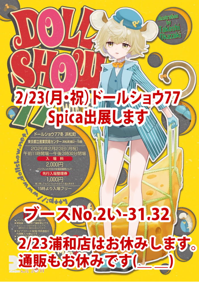 会場 浜松町都立産業貿易センター 日時2/23(月、祝) 11:00~15:30 公式HPはこちら→http://www.dollshow.net/ ![]() |