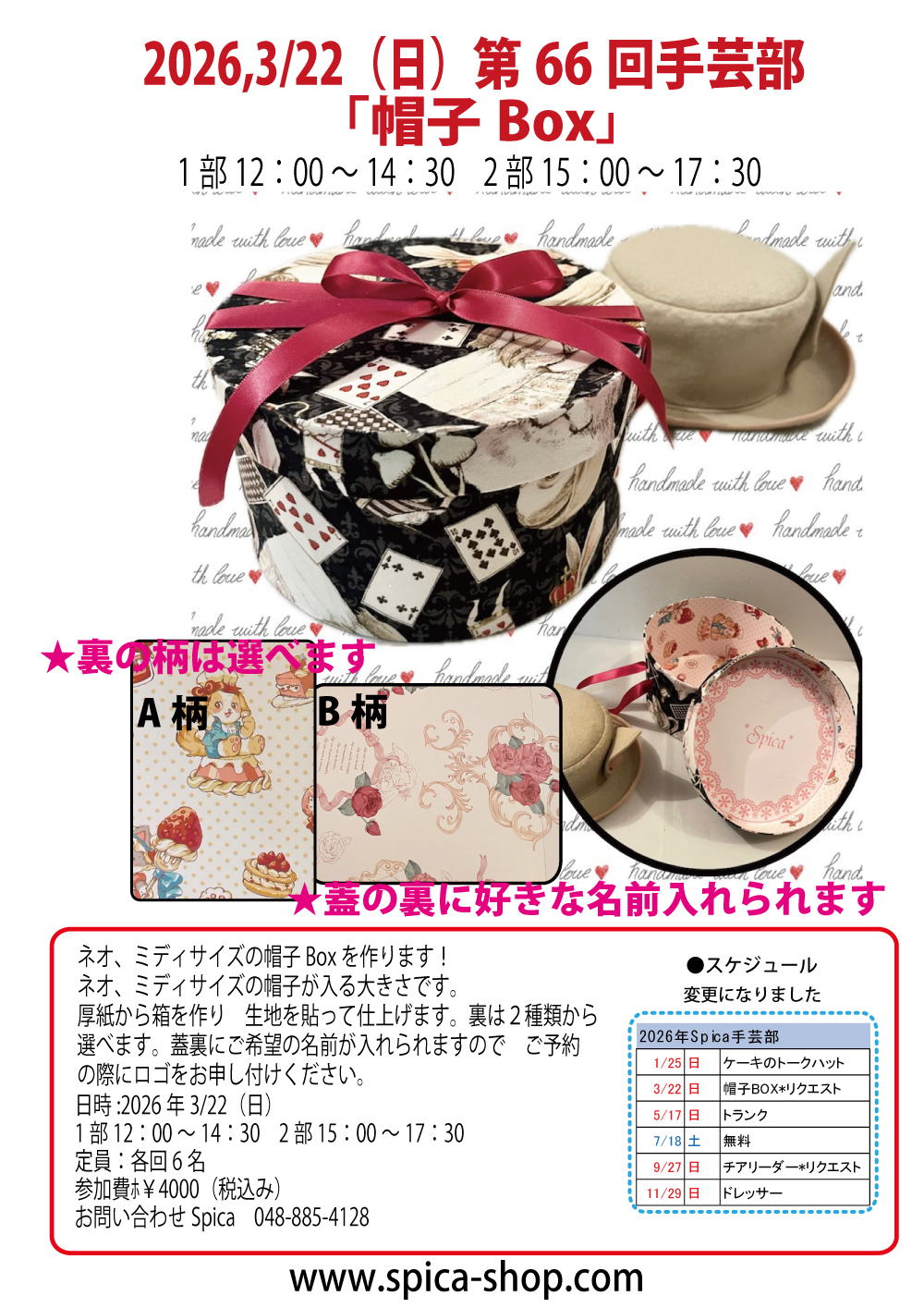 | no.club20260322 ・2026年3/22(日) Spica手芸部「第66回 帽子Box」※当日支払い(現金のみ)*1部よりお入れします 【日時】2026年3/22(日) 1部 12:00~14:30 2部 15:00~17:30(1部満席の場合開催) 【定員】各回6名 【費用】¥4000 【内容】ネオ、ミディサイズの帽子Boxを作ります!ネオ、ミディサイズの帽子が入る大きさです。 厚紙から箱を作り 生地を貼って仕上げます。裏は2種類から選べます。蓋裏にご希望の名前が入れられますので ご予約の際に通信欄にロゴをご記入ください。 例)*Spica* / すぴ子 (フォント 大きさ 色は選べません) ネオ、ミディサイズ 裏の種類が有りますので 通信欄にお書きください。 【持ち物】道具は揃っています。 必要であればエプロン、ブライス等ドール★終了後、完成した作品と撮影会をしますのでドールをお持ちの方はお連れください。 ・初心者の方でも簡単に作れる内容になっております。 ・小学生からご参加頂けます。(お一人で作業が難しいご年齢のお子様は、ご家族の方もご一緒に参加をお願いしております。) ※WSに参加されないお連れ様のWSご見学はスペースの関係や進行上不可とさせていただきます。 【ご予約について】 [ご予約方法] ご来店の場合はレジにてスタッフにお声掛けください。 お電話での場合は営業時間内にご連絡ください。(営業時間12:00~18:00・水曜以外) ネットご予約の場合はカートよりご予約ください。 ご予約段階ではお支払いは不要です。当日Spicaにてお支払い下さい。※ワークショップのお支払いは現金のみとさせていただきます。 定員が満員に達してからのご予約の場合、キャンセル待ちとさせて頂きます。 2部構成のワークショップは1部から予約をお入れします。2部の時間でしか参加できない場合は電話、メール、インスタDMからお問い合わせください。 [キャンセルについて] やむを得ない場合は、教室開催の1週間前までに必ずご連絡下さい。(※キャンセルはなるべくお控えください。) 1週間をきったキャンセルに関しましてはキャンセル料、キット代として後日半額お支払いをお願い致します。 【ご参加の際のご注意】 |